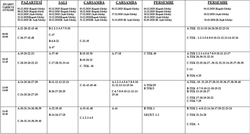 2) Kurumumuzda her ayın üçüncü tam haftası açık görüş, diğer haftalar ise kapalı görüş yapılacaktır. Görüşler; pazartesi, salı, çarşamba ve perşembe günleri 09:00- 17:00 saatleri arasında yapılacaktır.