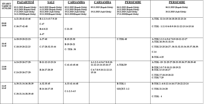 2) Kurumumuzda her ayın üçüncü tam haftası açık görüş, diğer haftalar ise kapalı görüş yapılacaktır. Görüşler; pazartesi, salı, çarşamba ve perşembe günleri 09:00- 17:00 saatleri arasında yapılacaktır.