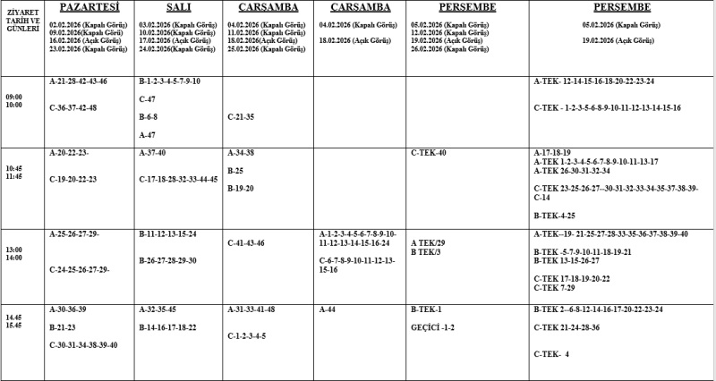 2) Kurumumuzda her ayın üçüncü tam haftası açık görüş, diğer haftalar ise kapalı görüş yapılacaktır. Görüşler; pazartesi, salı, çarşamba ve perşembe günleri 09:00- 17:00 saatleri arasında yapılacaktır.