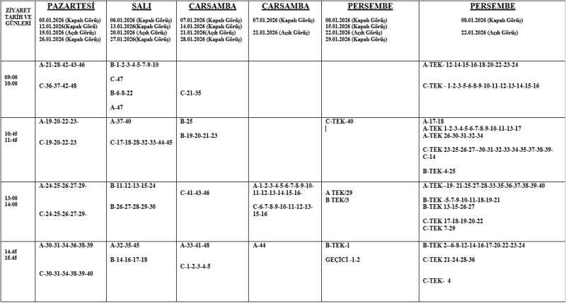 2) Kurumumuzda her ayın üçüncü tam haftası açık görüş, diğer haftalar ise kapalı görüş yapılacaktır. Görüşler; pazartesi, salı, çarşamba ve perşembe günleri 09:00- 17:00 saatleri arasında yapılacaktır.